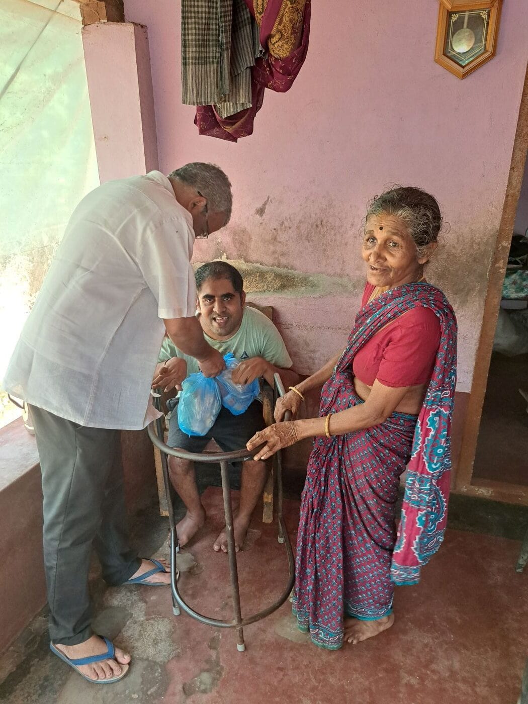 In de binnenlanden rond Kasaragod (Kerala) ondersteunt dit project kinderen met een beperking die thuis wonen bij hun ouders. Zij kunnen niet voor zichzelf zorgen en leven vaak in zeer moeilijke omstandigheden. Hun ouders zijn op leeftijd en leven in armoede, waardoor de zorg zwaar is en soms nauwelijks vol te houden. Het project helpt deze gezinnen met voedselpakketten, medicijnen, luiers, maandverband en voedzame maaltijden. Vooral bedlegerige kinderen met een ernstige beperking die niet naar school kunnen, krijgen zo de ondersteuning die zij hard nodig hebben. De gezinnen worden persoonlijk bezocht.